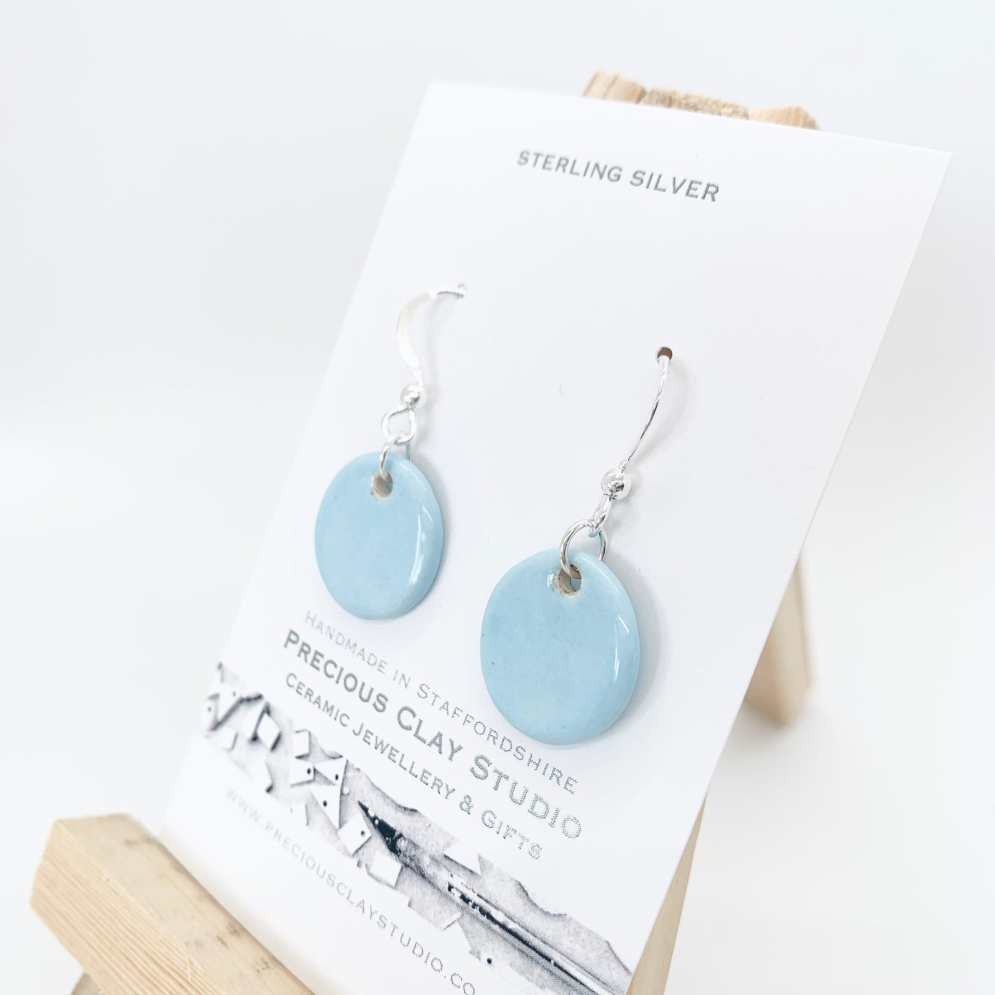 Hand made 1.5cm ceramic circle earrings on sterling silver hook wires. Blue glaze all over
