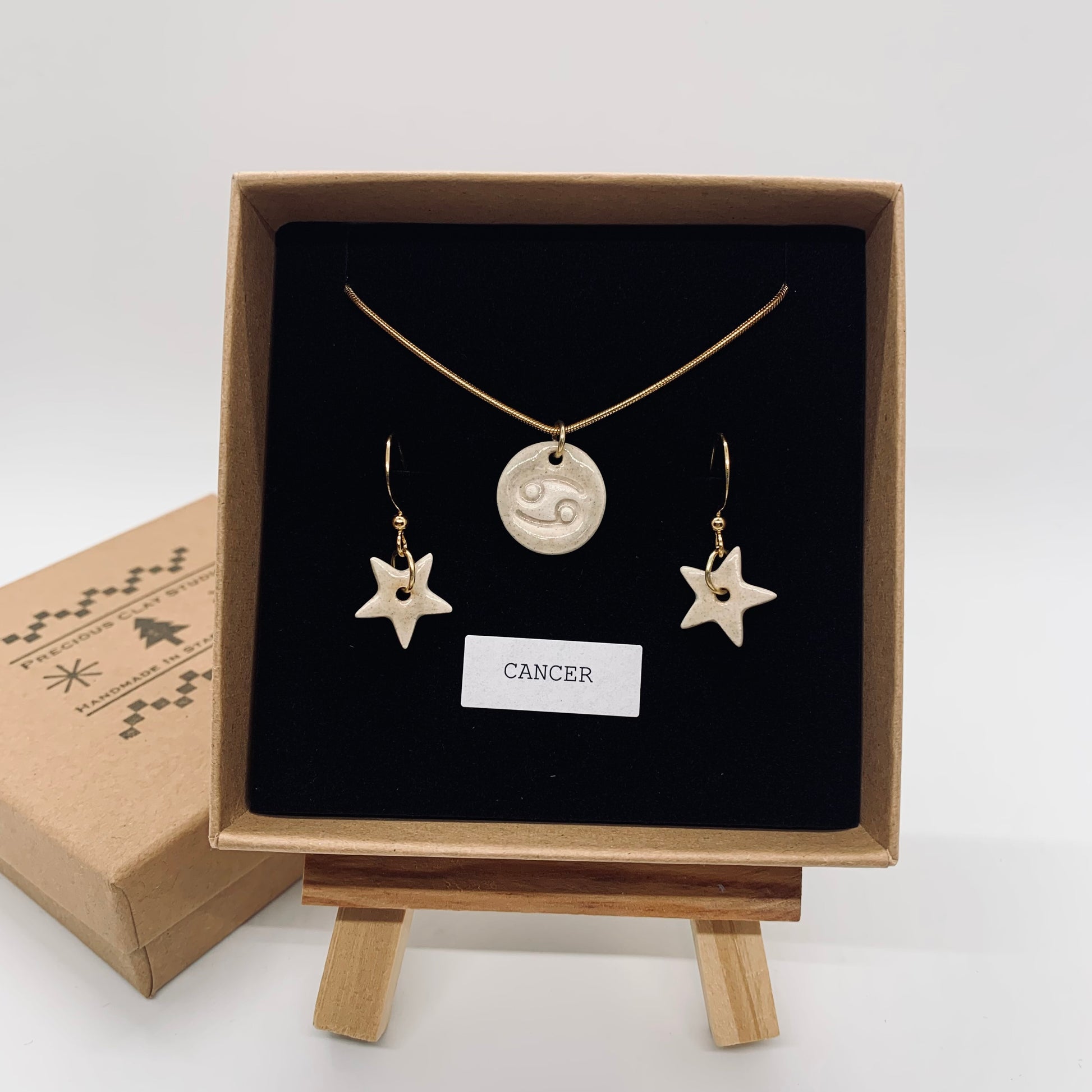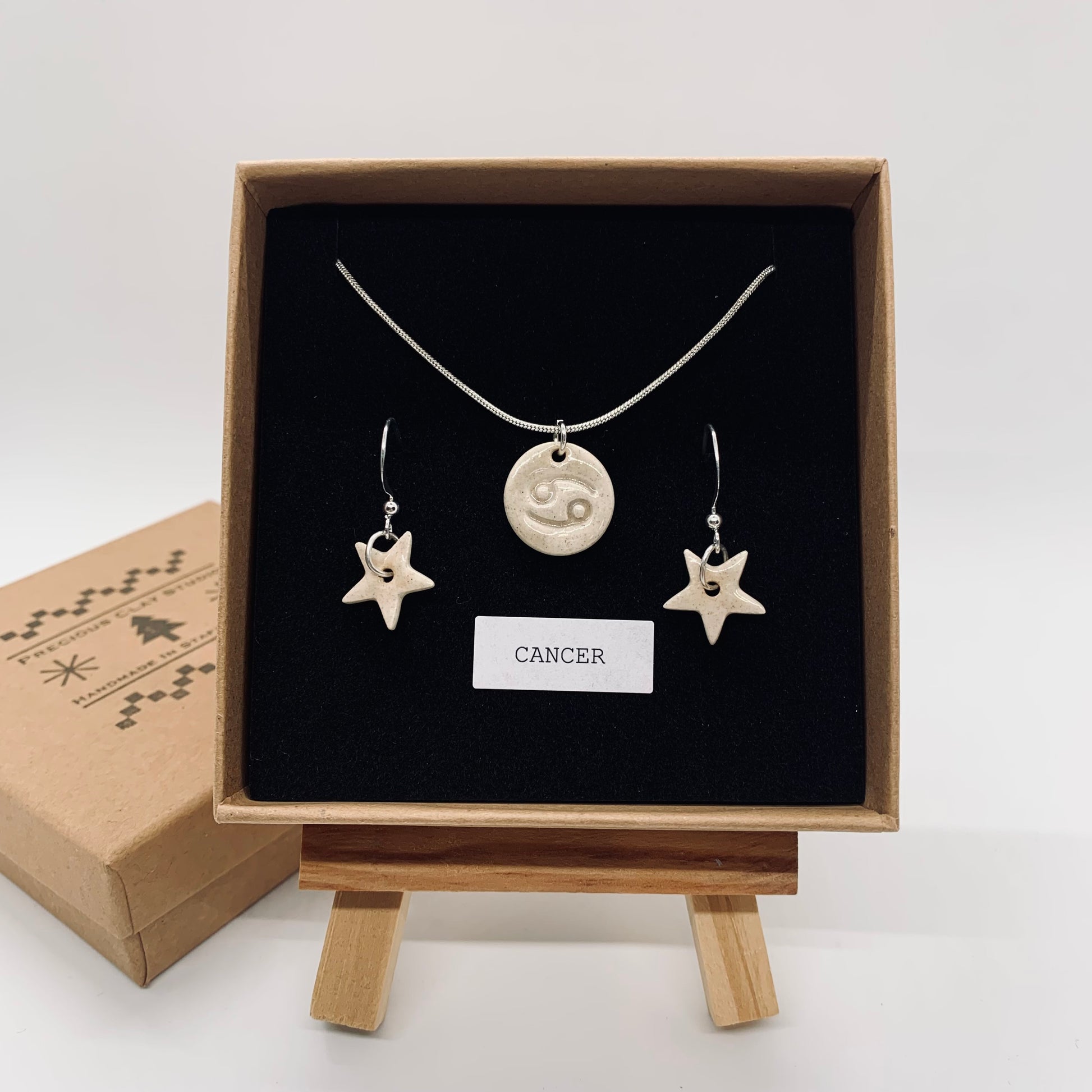 Star sign set with necklace (18inch) and star shaped drop earrings. Neutral glaze. Gold or silver plated option available.